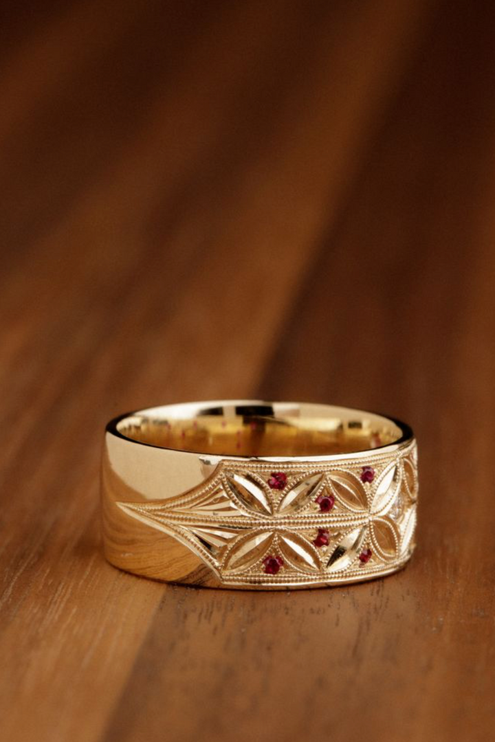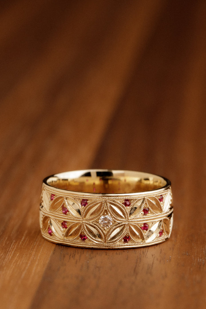 The Elliette band is a 14k yellow gold cigar band inspired by symmetry, vintage textiles, and pattern work. It features a round white brilliant diamond surrounded by rubies, bead set to emphasize contrast and precision. The hand engraving highlights careful design and craftsmanship, creating a statement band that balances boldness with refined detail.