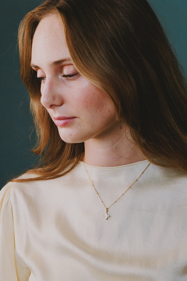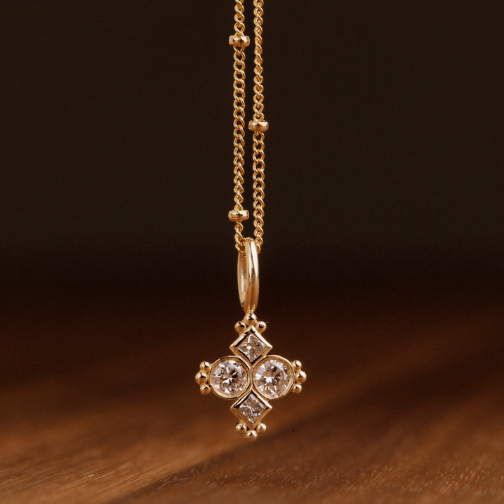 The Adia Charm celebrates the harmony of stone and form available in diamond, ruby, or champagne diamond.