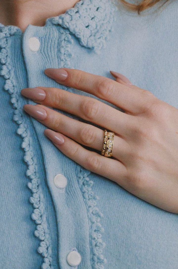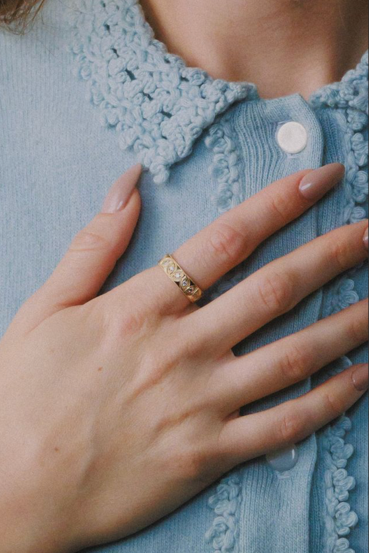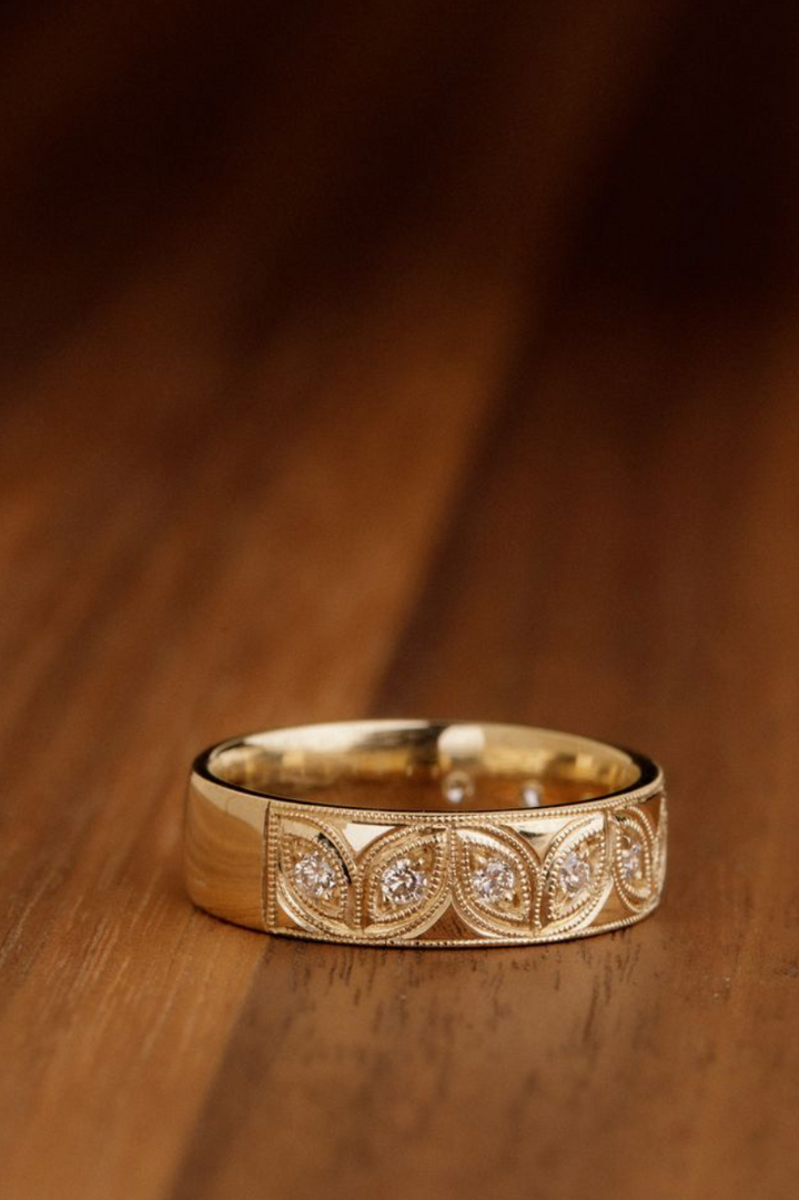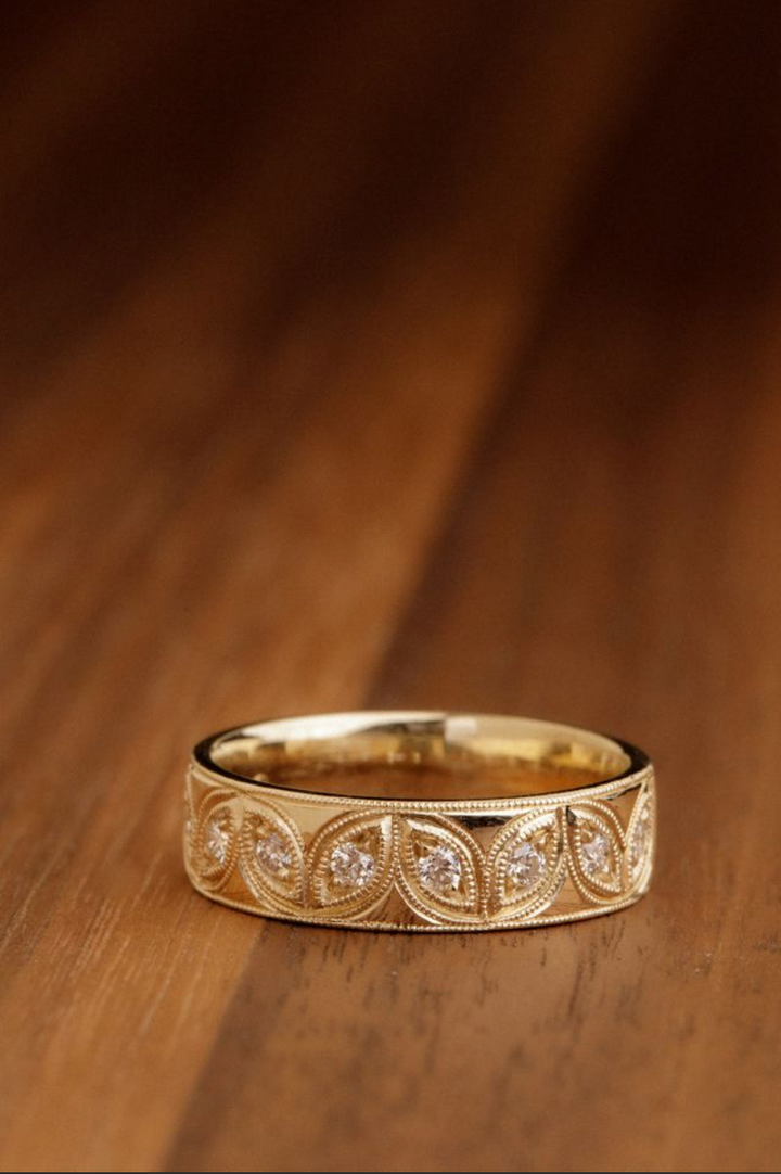 A 5.5mm band inspired by my signature hand-engraved leaf motif. Designed to carry the motif’s shape, Esme adds subtle detail to any stack. This band was created to be an elevated yet versatile piece—easy to wear every day, while remaining instantly recognizable as my work. As one of three variations, it reflects both refinement and versatility, offering a design meant to be collected and worn in many ways.